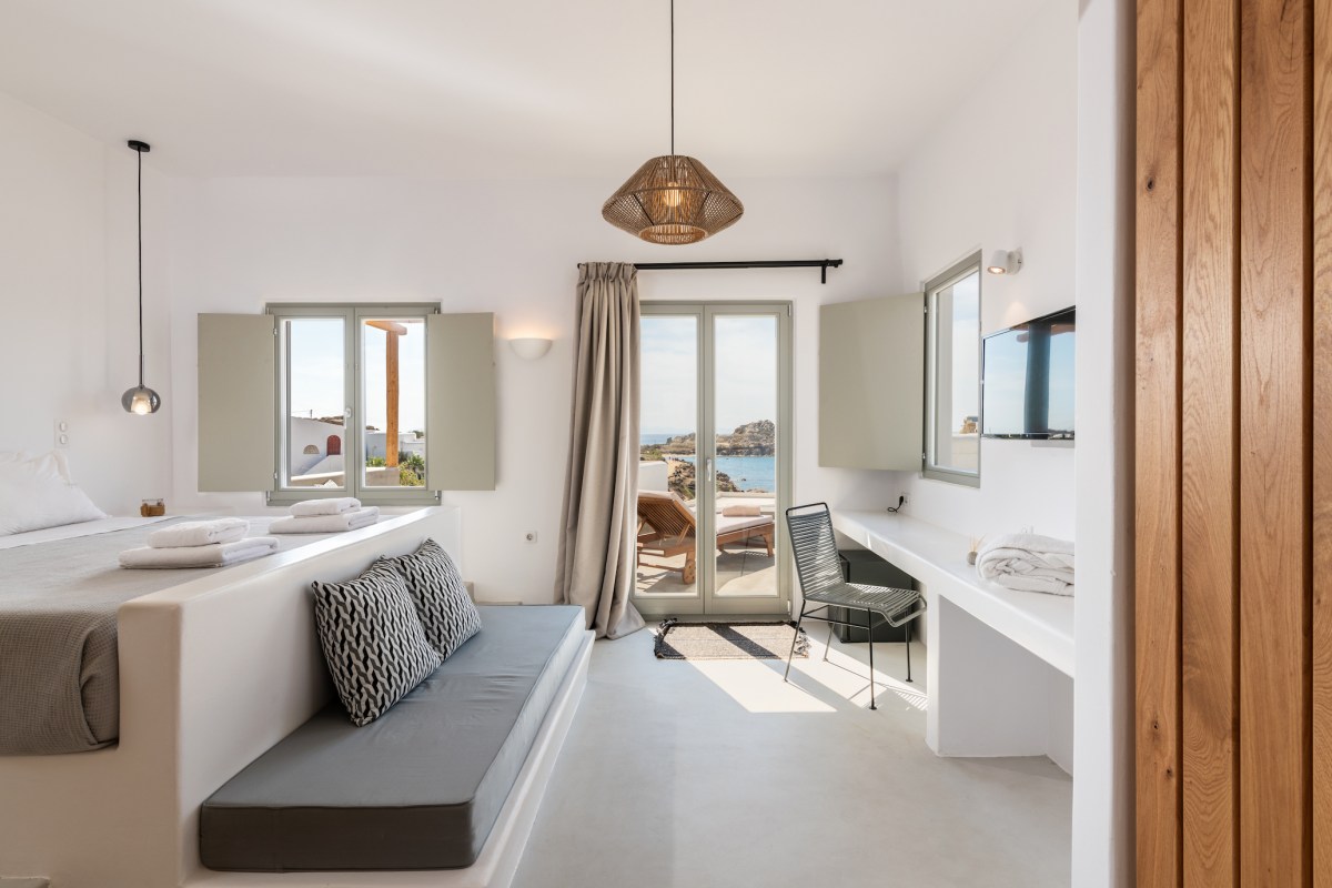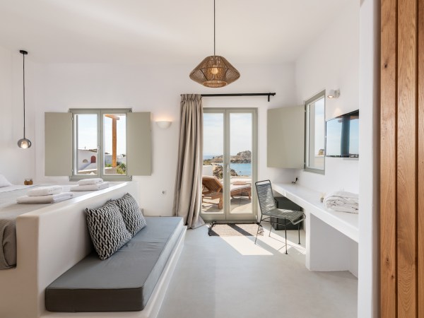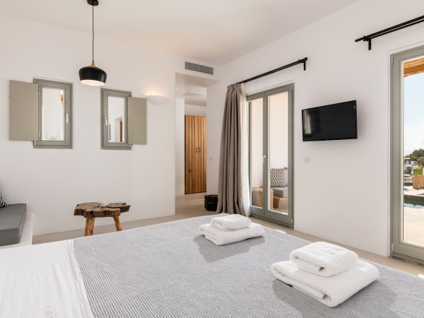 Located in Platis Yialos Mykonos, Trinity is a 7 bedroom villa with a private outdoor swimming pool, terrace and a bar. The property is set a few minutes walk from Scorpios, Nammos, Soho House, and Paradise beach.